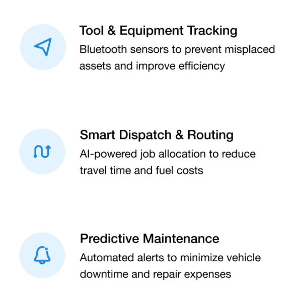 Tracks vehicles and tools, preventing misplaced equipment and ensuring technicians have what they need on-site.
